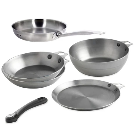 Les 5 poêles différentes de cette batterie Minéral B amovible, toutes fabriquées en France, sont faites uniquement à partir de fer : une cuisson rapide avec de hautes températures atteintes pour dorer et saisir idéalement. Ces ustensiles authentiques sont entièrement recyclables et le fer leur offre une résistance à toute épreuve, réputés presque indestructibles. Elles sont toutes garanties 1 an et compatibles tous feux dont induction, et peuvent même passer au four (retirez bien le manche au préalable).