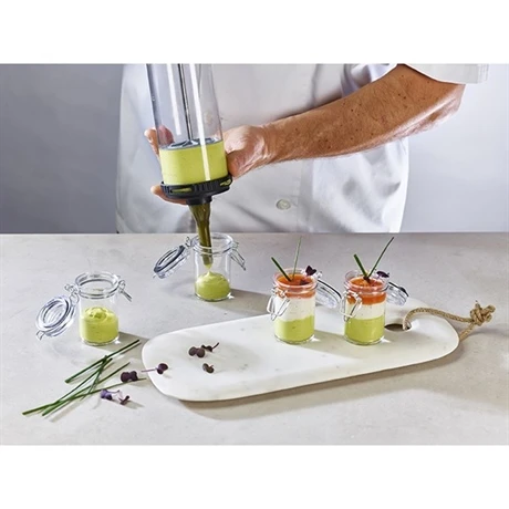 Plus facile à remplir, et plus globalement, à utiliser qu’une poche pâtissière, votre travail sera désormais rapide et précis à l’utilisation des 2 douilles comprises. Doté d’une contenance de 0,75 L, votre tube à pression De Buyer est fabriqué en plastique transparent pour visualiser en temps réel le niveau restant dans celui-ci. Gradué en cl et en oz il est également équipé d’une molette de manière à pouvoir régler facilement la pression et ainsi doser précisément la quantité à verser (de 1 à 5 cl).