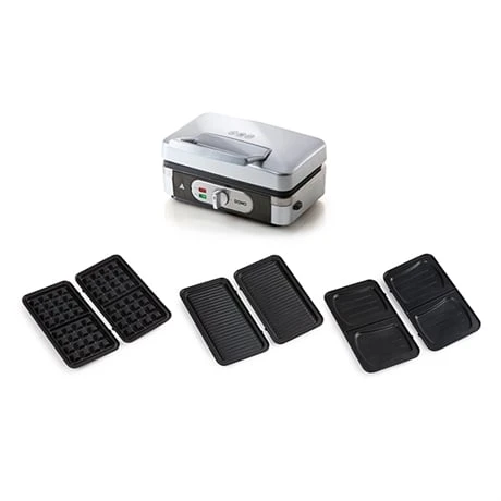 Grâce à ses plaques interchangeables, cet Appareil 3 en 1 permet de cuire au choix de belles gaufres, de délicieux croques-monsieur, ou de faire griller vos sandwichs et paninis. Le thermostat est réglable, pour une cuisson légère, normale ou dorée à point. Facile à utiliser, 2 témoins lumineux indiquent la marche de l’appareil et la fin de cuisson. Le revêtement anti-adhésif de haute qualité garantit un démoulage rapide et propre et les plaques sont amovibles pour un nettoyage facile.