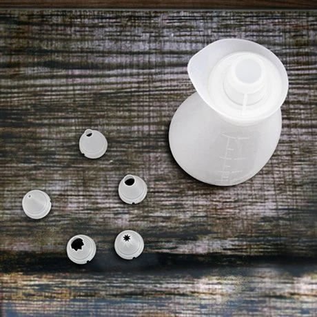 Le Flacon souple verseur en silicone avec 5 douilles est l’ustensile idéal pour verser vos préparations et décorer vos desserts ! En silicone souple, ses graduations intégrées permettent de doser très facilement les quantités avant de les verser. Transparent, il permet de visualiser en un instant la quantité versée dans le flacon.