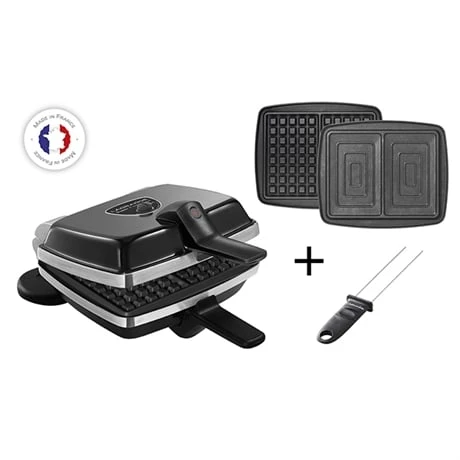 Idéal pour confectionner de délicieuses recettes, le gaufrier électrique Super 2 Antiadhésif 2 plaques (gaufres et croque-monsieur) avec pique coloris noir est un appareil facile à utiliser, à garder en bonne place sur le plan de travail de la cuisine. Son look rétro lui confère un aspect authentique, à l’image des premiers gaufriers électriques. Les résultats sont impeccables : pour une cuisson homogène, il est réversible sur socle pour une bonne répartition de la pâte. Ses plaques antiadhésives amovibles permettent de préparer des gaufres bruxelloises moelleuses à cœur et croustillantes à l’extérieur, mais également des croque-monsieur, des sandwiches chauds garnis de viandes, de légumes, de fromages… Le revêtement anti adhérent double couche des plaques conçues en fonte d’aluminium assure des cuissons sans ajout de matière grasse, et des nettoyages faciles.