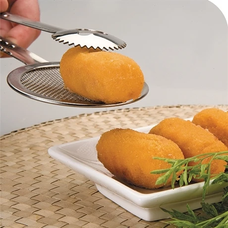 Egouttez et attrapez en même temps vos aliments frits avec la pince à friture en acier inoxydable. En comparaison avec une pince classique, celle-ci est très pratique grâce à son filet spécial friture, celui-ci permet de ne pas retenir l’huile de friture quand vous sortez vos aliments. La pince convient parfaitement pour toutes tailles d’aliments, les petits et gros.