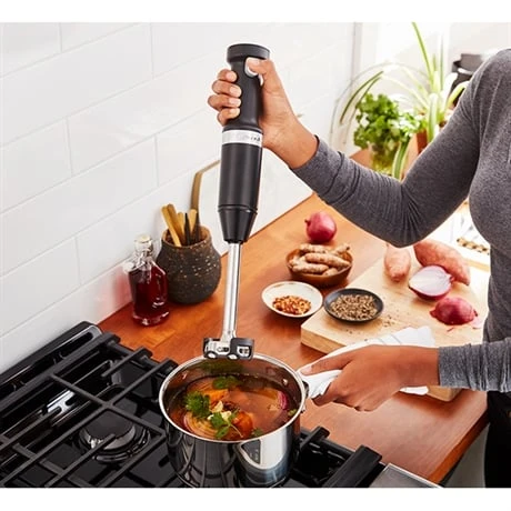 Avec ce mixeur plongeant sans fil, vous bénéficiez d’une liberté de mouvement pratique en cuisine. Toujours dans l’optique de votre confort, Kitchenaid accompagne ce pied à soupe d’un bol mélangeur sans BPA avec couvercle de 700 ml et d’un embout clipsable antirayures pour protéger le fond de vos récipients. L’axe mélangeur a une belle hauteur de 20 cm pour mixer facilement dans des récipients profonds. Amovible, il passe au lave-vaisselle, tout comme le bol et l’embout protecteur.
