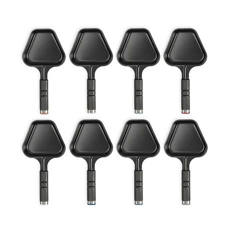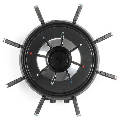 8 caquelons également identifiable par leur manche de couleur recevront votre fromage à fondue. La plaque à griller permettra de cuire vos lamelles de champignons ou de légumes et gardera vos pommes de terre au chaud.
