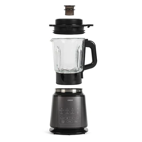 Le blender chauffant DOP212 Livoo est un blender à 8 fonctions intégrées pour faire des soupes veloutées, soupes avec morceaux, smoothies, jus, milkshakes, laits végétaux, hacher des aliments, et préparer de la nourriture pour bébé. Le blender chauffant dispose d’un grand bol en verre gradué de 2 L pouvant accueillir jusqu’à 1,2 L pour les soupes et jusqu’à 1,75 L pour les jus afin de réaliser des préparations pour toute la famille. Pratique, ce blender possède un départ différé pour programmer le blender et ainsi facilité l’organisation de votre quotidien. Grâce à celui-ci, la réalisation des soupes peut se faire en 30 minutes pour ainsi optimiser votre temps en cuisine. Composé de 4 pieds antidérapants, le blender Livoo DOP212 offre une stabilité pour ne pas risquer de renverser les préparations. Pour faciliter le nettoyage, le blender possède une fonction auto-nettoyage. Une brosse est aussi incluse pour laver en profondeur si besoin. Doté d’une puissance de 800 W et d’un couteau 6 lames en acier inoxydable, le robot pourra atteindre jusqu’à 26 000 r/minute et ainsi mixer rapidement et parfaitement les aliments de façon homogène. Le panneau de commande est tactile avec un affichage LED.