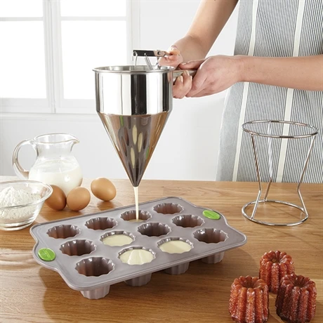 Une simple pression ouvre l’entonnoir et vous permet de verser proprement la quantité de pâte souhaitée dans les empreintes de votre poêle. Vous pouvez le rempli avec jusqu’à 1 litre de pâte et contrôler le débit que vous souhaitez verser. Cet entonnoir peut également vous servir pour remplir différents moules et ustensiles de cuisson lorsque vous disposez d’une pâte liquide ou semi-liquide : crêpes, canelés… Pratique, il peut également être utilisé pour remplir vos verrines sans tâcher vos verres.