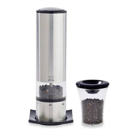 Petite merveille technologique, ce coffret moulin Ă poivre Ă©lectrique Elis Sense de Peugeot se dĂ©clenche d’une simple touche tactile simultanĂ©e sur le corps et le bouton. L’Ă©clairage LED du moulin permet ensuite de contrĂ´ler avec prĂ©cision le dosage obtenu sur mesure grâce au système de rĂ©glage de mouture U’Select. Ce système est composĂ© de 6 moutures diffĂ©rentes pour le poivre (et 3 pour le sel). Grâce Ă la fiole garnie Ă usage d’entonnoir doseur et Ă la coupelle qui l’accompagnent, le remplissage et le service sont impeccables. Il est en inox et polycarbonate. Il fonctionne avec 6 piles AAA fournies.