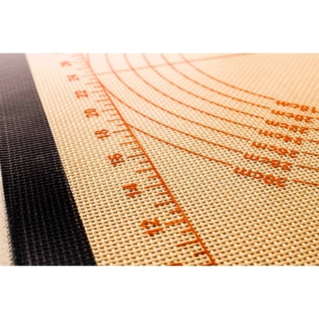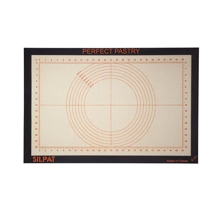 La toile pâtissière graduée Silpat 58,5 x 38,5 cm possède des graduations pour calibrer parfaitement des pâtes à tartes rondes, carrées ou rectangulaires.